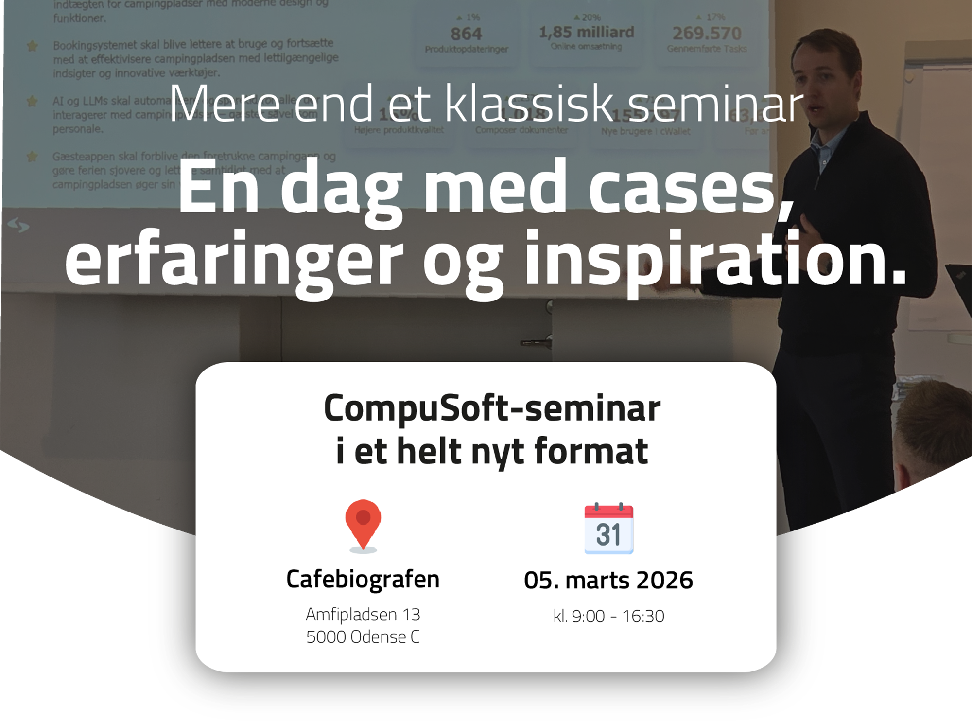 Vi inviterer alle vores kunder inde for campingbranchen i Danmark, til én dag fuldt med nyheder fra CompuSoft, konkrete erfaringer fra branchen og spændende indlæg fra samarbejdspartnere, der arbejder med digitale gæsterejser i praksis.